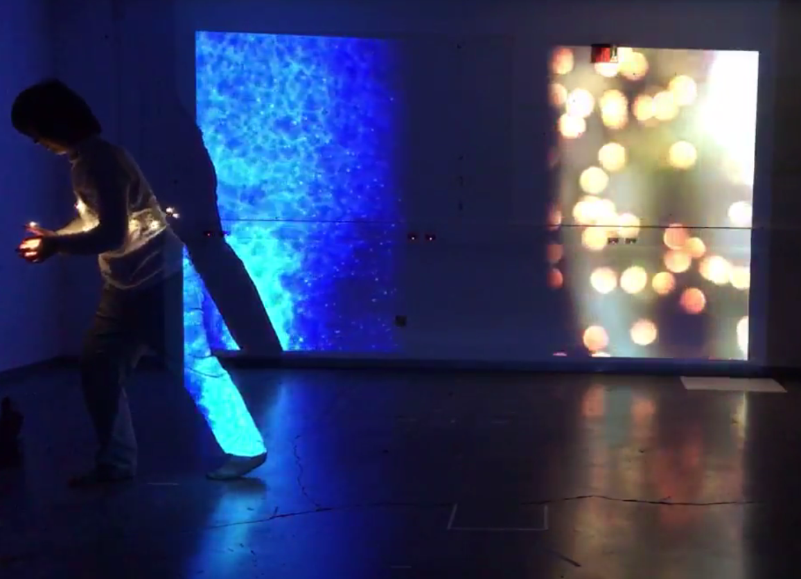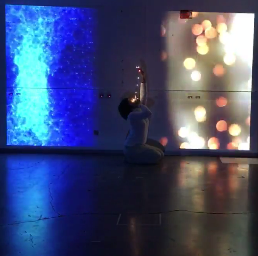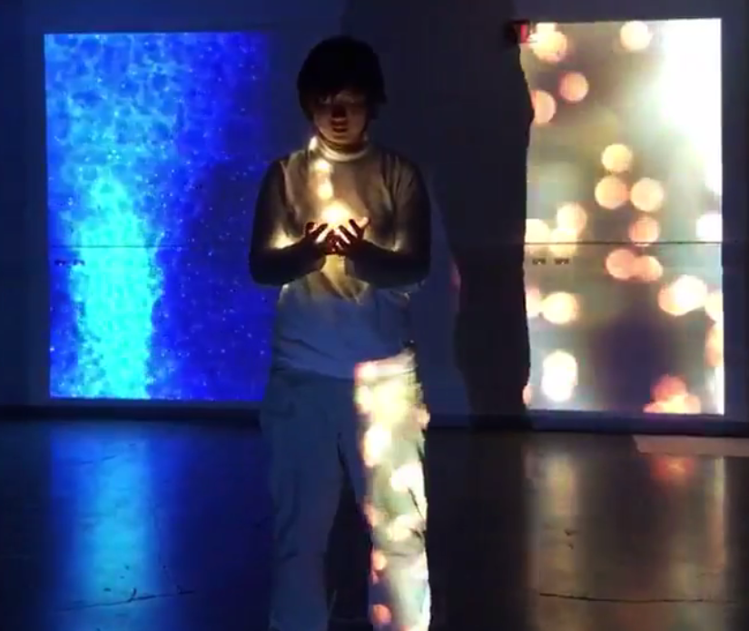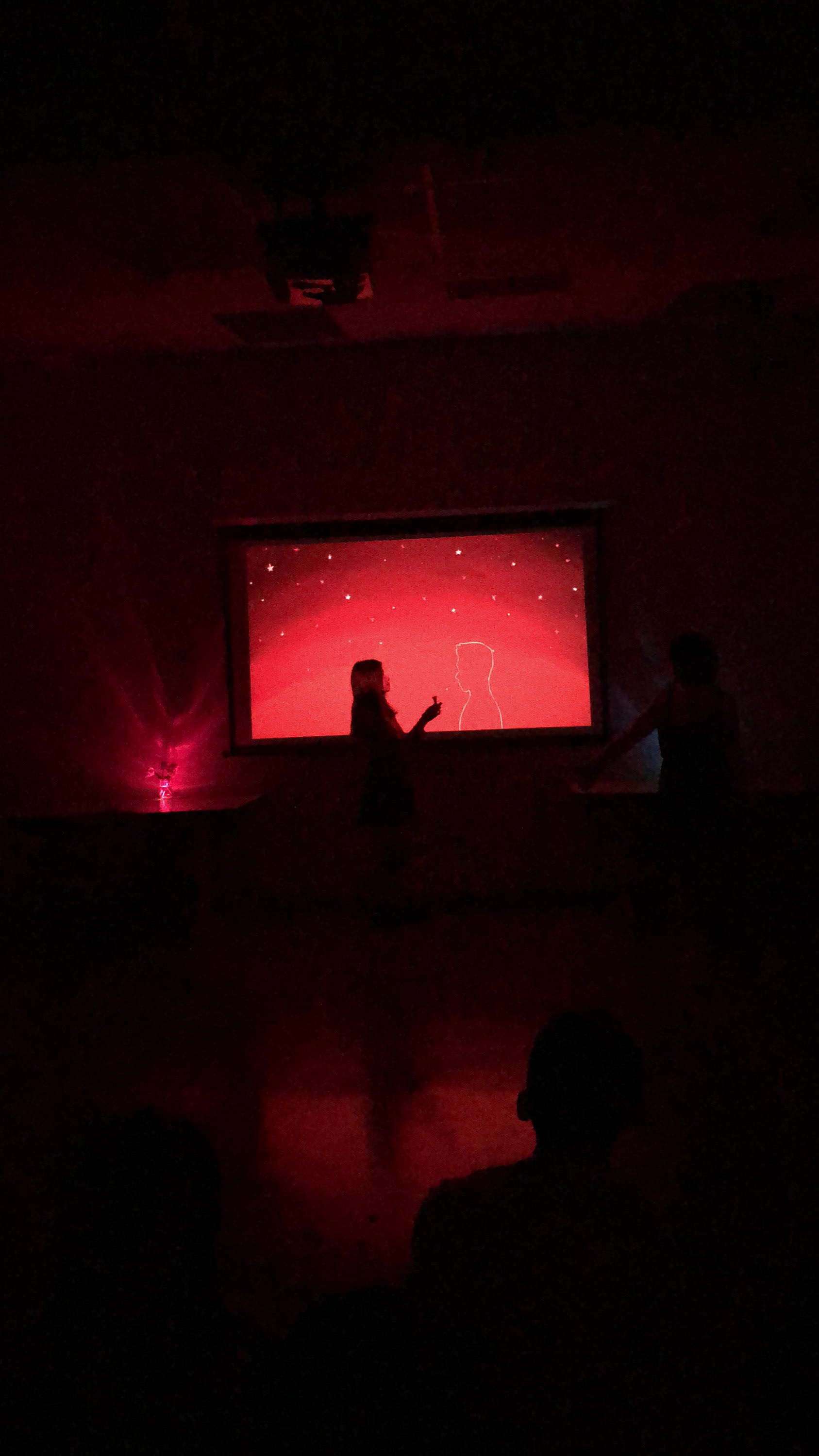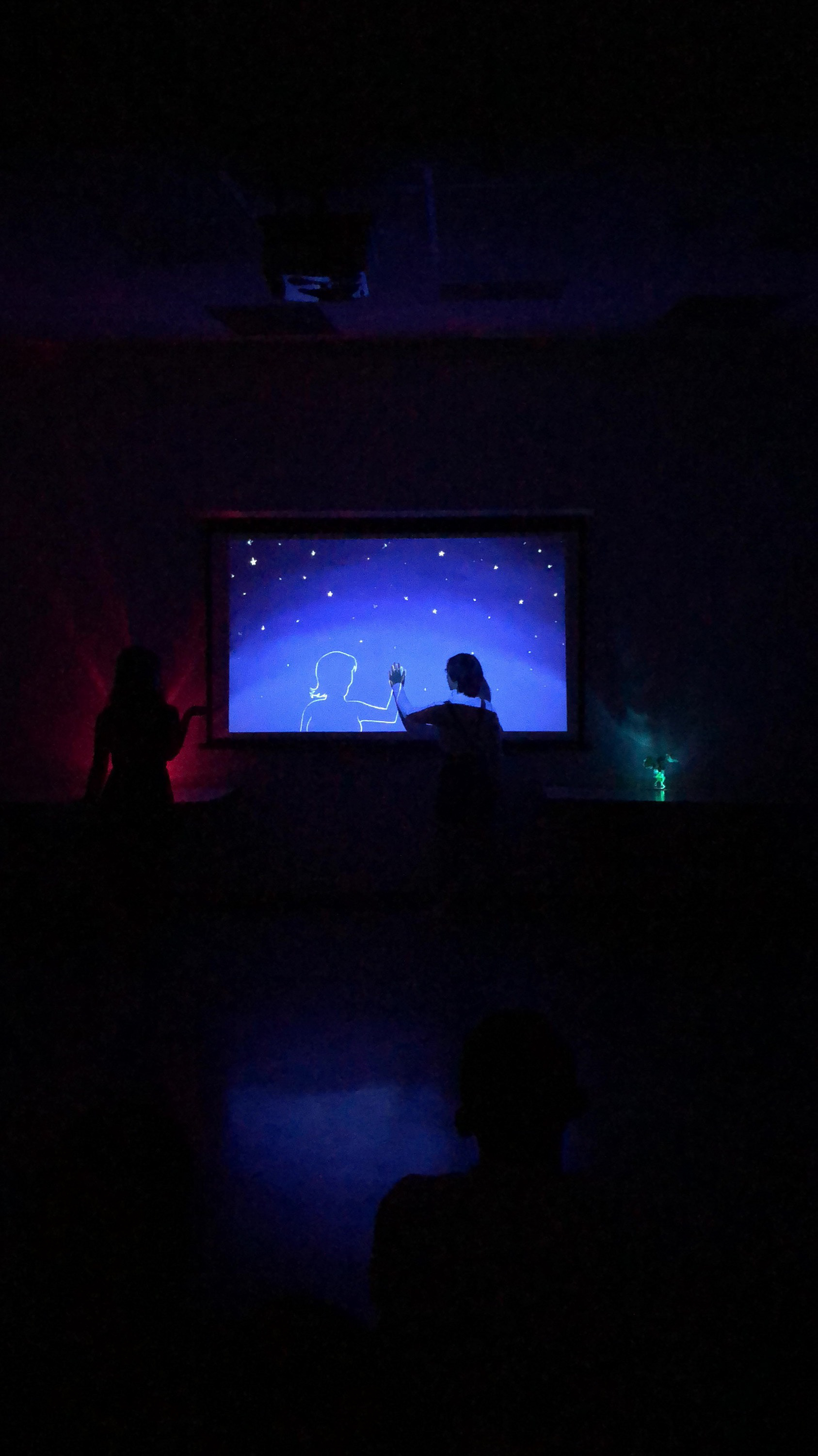 A joint performance in which performers interact with echoes of their past as animations on a projected screen.