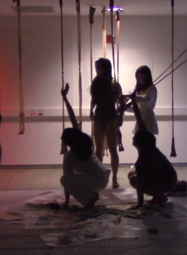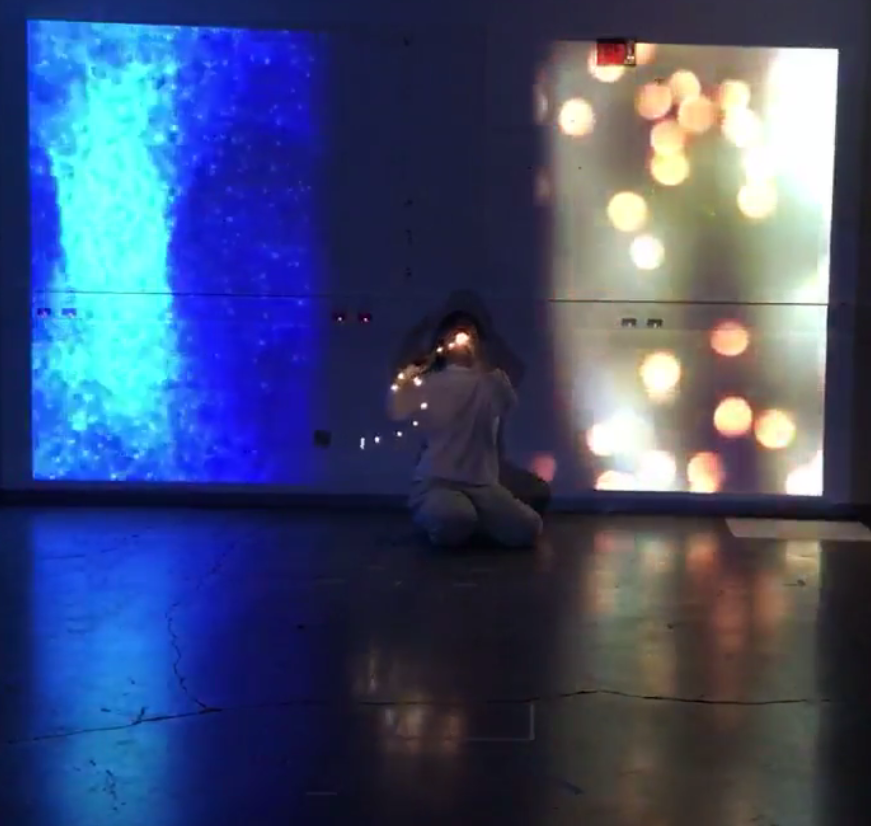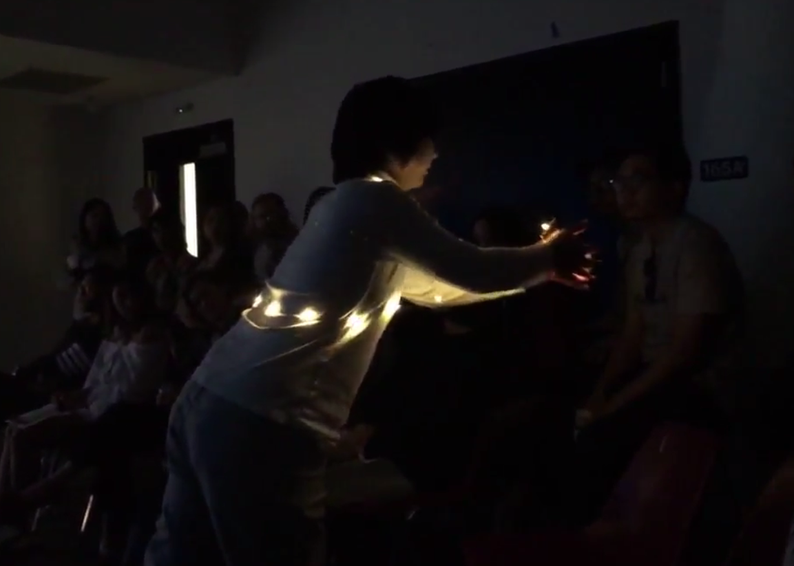 This performance highlights the collusion between heart and mind. Represented by a string of lights, the performer painstakingly pulls their "heart" out of their mouth, reifying the intangible such as emotion and thoughts. The performer wraps themself in the light, attempting to keep it close, but wanders around the audience and offers their light to the onlookers in the dark. Projections on either side of the performer create a triptych-like image. One represents the warm heart, while the other represents the cold mind. By using light as the physical representation and pulling it outside of oneself, along with standing in the darkness between representations of heart and mind, the performer brings to question the idea of giving one's light away to another.