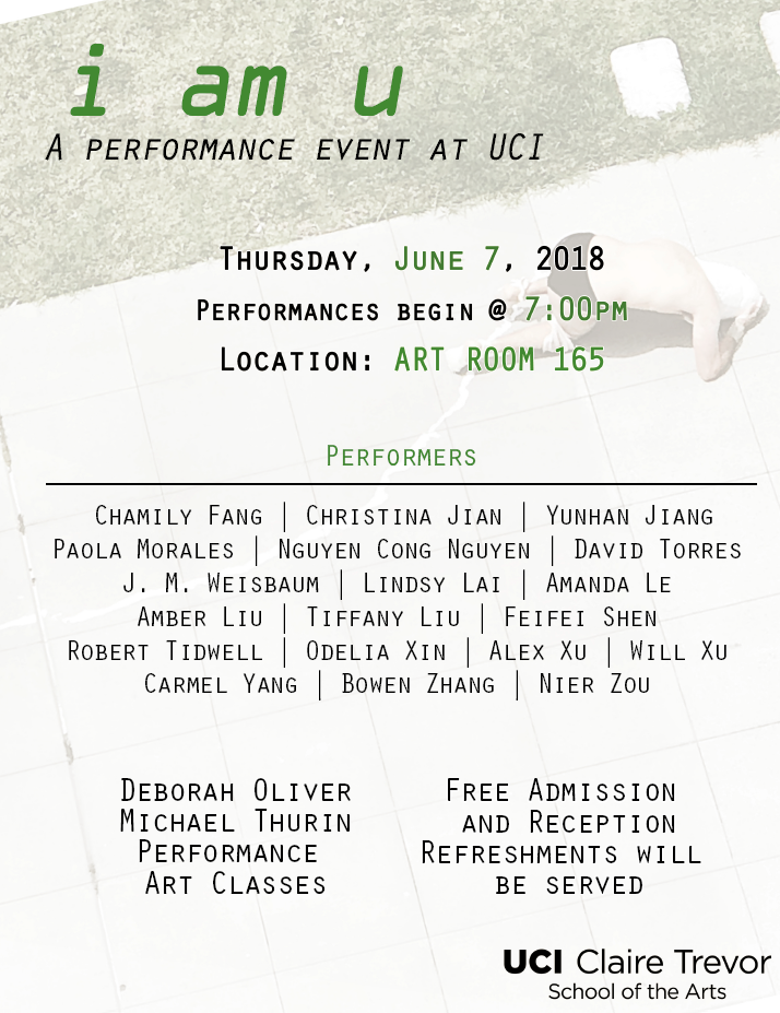 i am u: A Performance Event at UCI, Performed at Claire Trevor School of the Arts Room 165, UCI, June 7, 2018.