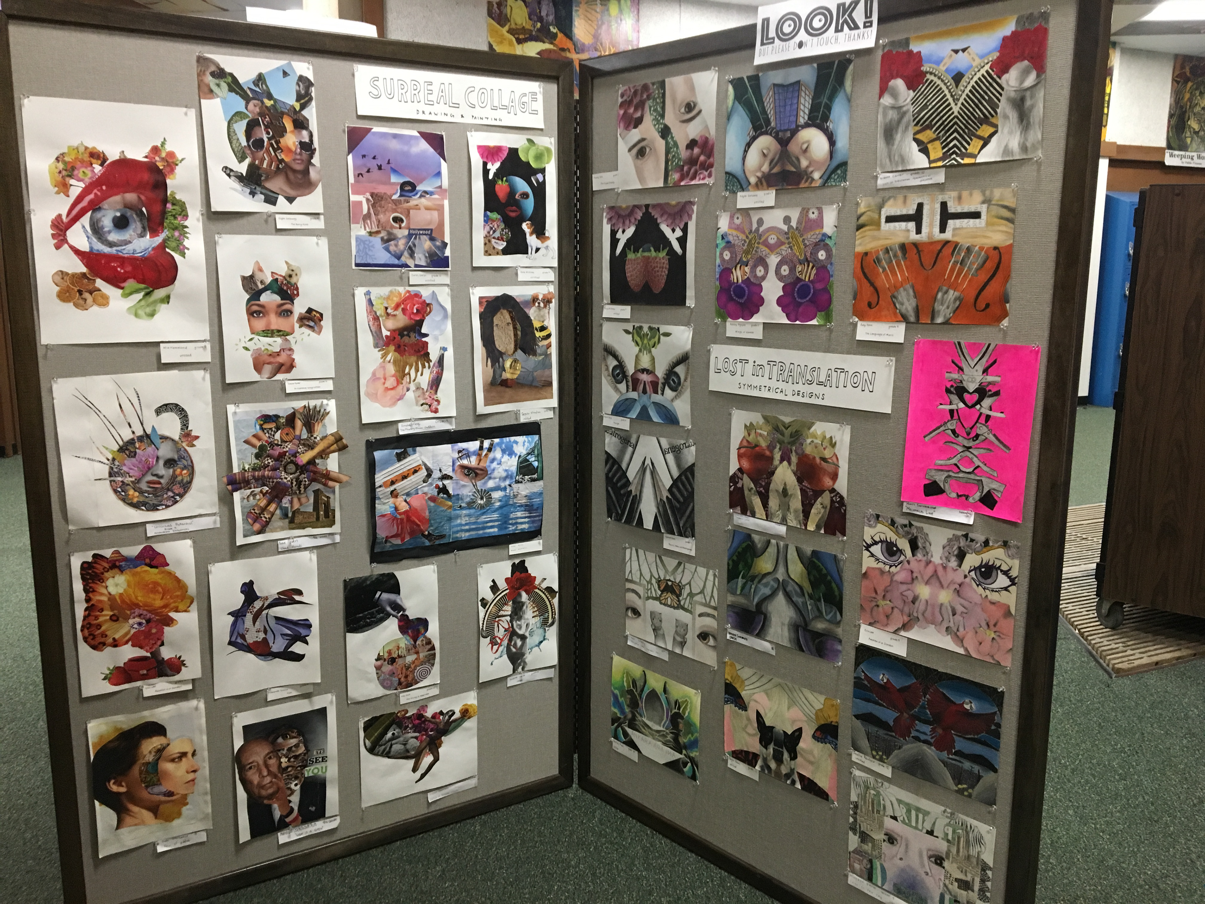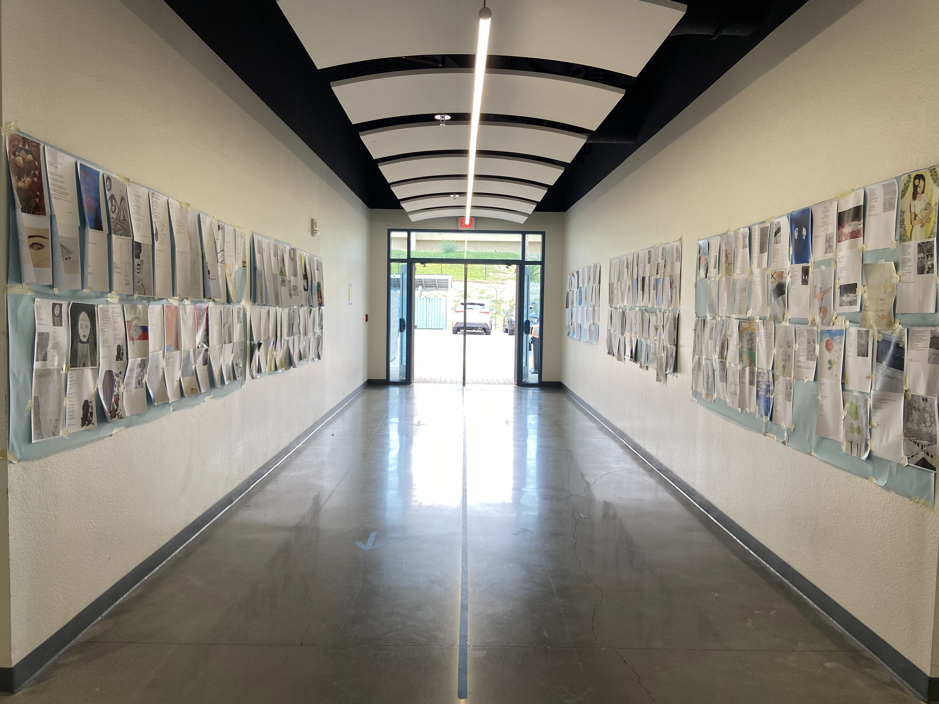 Spoken Word, Hallway Exhibition showcasing Drawing&Design student artworks alongside Creative Writing student poems